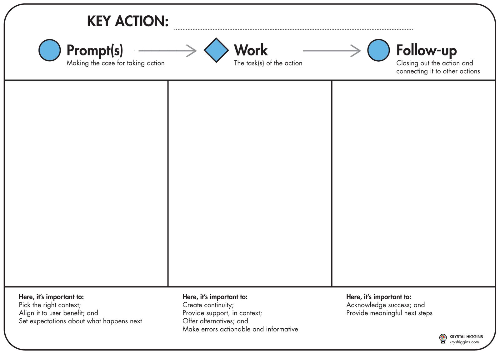 Because onboarding is a journey, you can’t solve it all up front with a single tutorial that tries to explain your features and is narrowly focused only on moving short-term metrics. You need to help your customers and their downstream end-users put information in context. That’s where guided interaction comes in. It’s an approach that focuses on weaving guidance into the flow of an action, allowing it to be self-paced, contextual, actionable, and authentic. First, break down your onboarding journey into the important actions that can, cumulatively, lead someone to your definition of core use—I include an activity for journey mapping and prioritizing key onboarding actions in my book, but you can also use cohort data and user research interviews from existing, core users to see which actions propelled them to success. For example, in a question-and-answer platform, the actions of posting a first question and enabling notifications could both be important actions for a new user to take. Then, break down how to guide someone through the flow of each action. What’s the most relevant time and place to prompt someone to take that action? What can you do throughout the flow of the action to help them through the work? And how can you follow up after it’s completed to connect them to other actions they might take next? Check out my free storyboard template for breaking down these key onboarding actions.