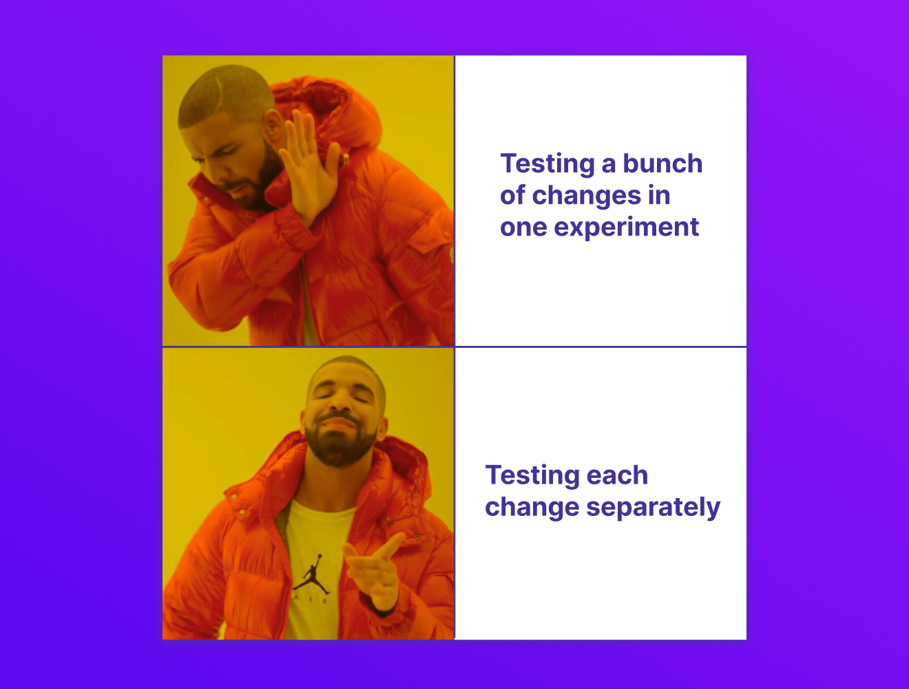 Test one thing at a time in order to learn and understand what changes cause what effect in an experiment.Let’s say you want to optimize your sign-up flow. Users drop off at each of the 5 steps, limiting the number of users joining your product. You look at each step, do some usability testing, and design new variants to avoid roadblocks in the old designs. You could run a test comparing the current experience to your new flow and measure how many more users get all the way to completion. But then you’d lose a great opportunity to learn why your changes helped.If you tested each new step separately (either running experiments one after another, or in parallel at the same time), you could see how much each individual change helped. Perhaps your changes helped for 3 steps but hurt for 2—you still ended up ahead, but if you’d tested each change separately, you could have seen even more gains by only shipping the changes that worked.One of the changes might have had surprising benefits or problems that can be applied to other parts of the product. Isolating specifically what works and what doesn't is key to scaling the impact of experiments beyond the immediate test.