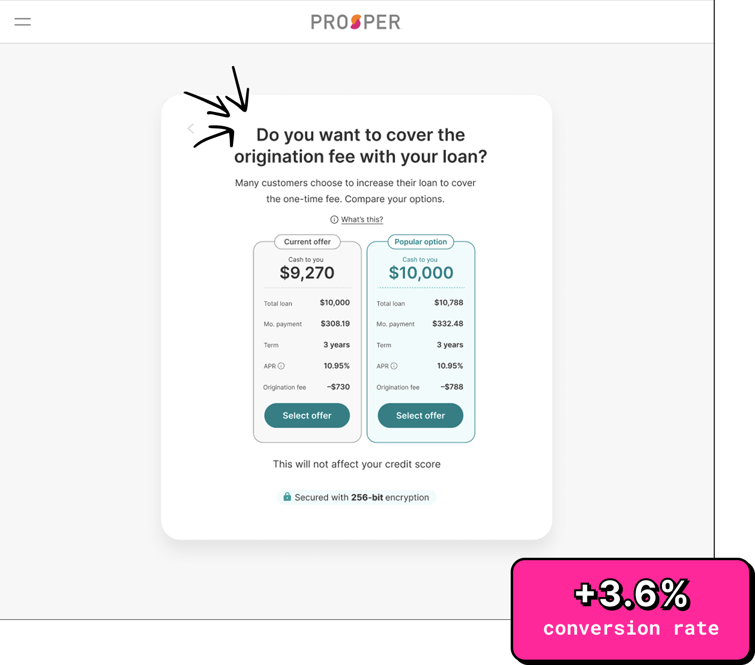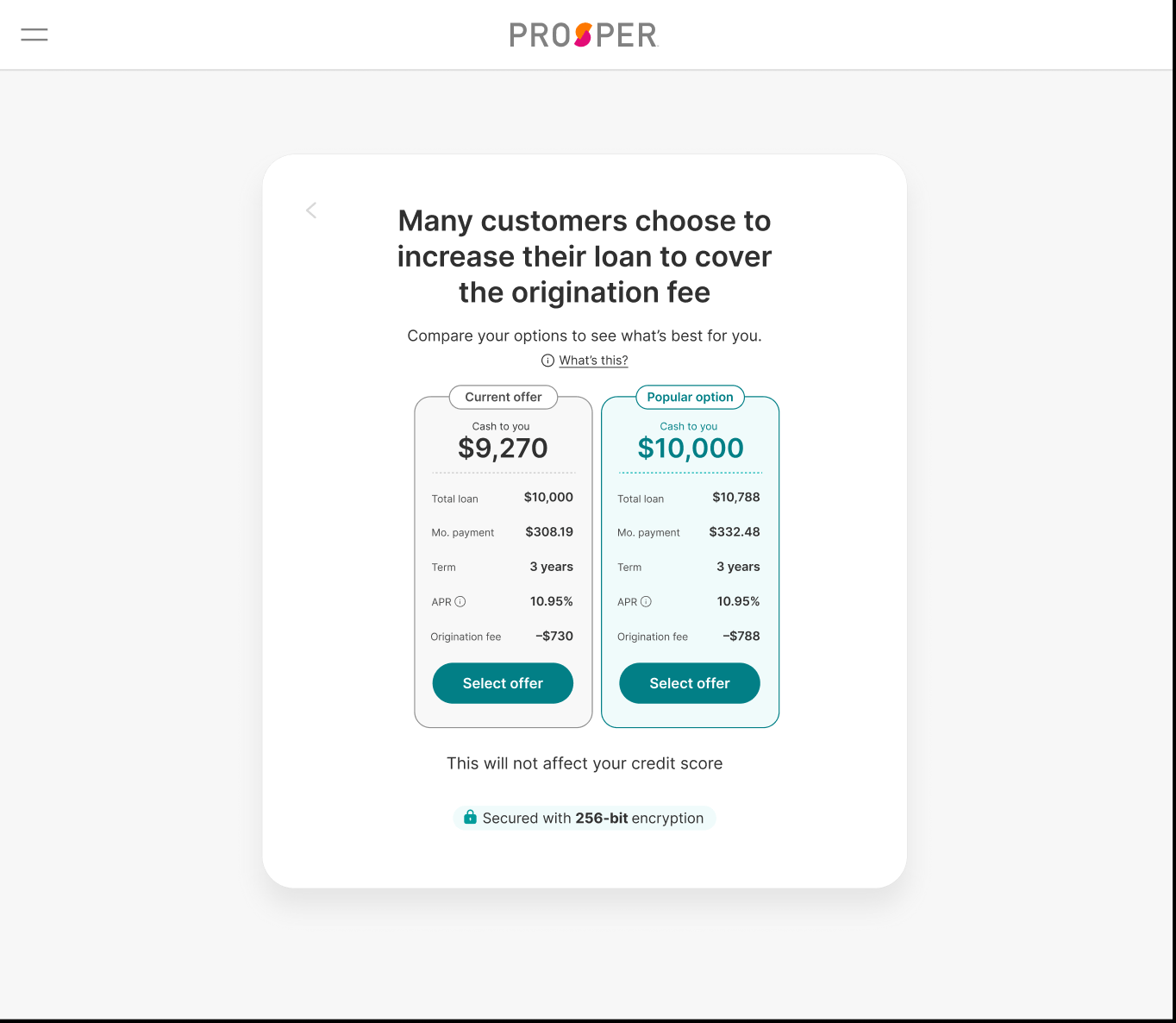 We show them how much cash they'd receive if they choose their current offer versus how much they'd receive if they select the "Popular option" in which the origination fee is added on top of their original loan request amount.