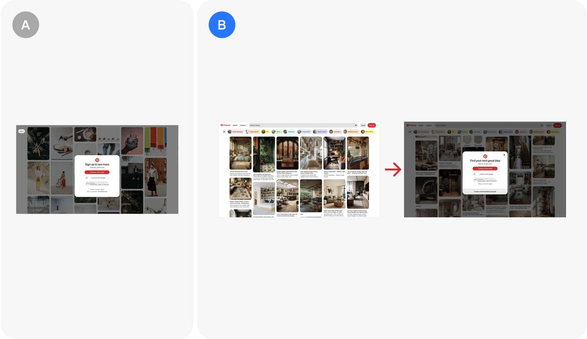The ABtest.design case study on Pinterest’s logged out experience claims that allowing free content exploration before signup led to a 20% increase in signups. Ok, if you let users view pages without forcing a sign up wall that could be good for increasing signups. But, is it?