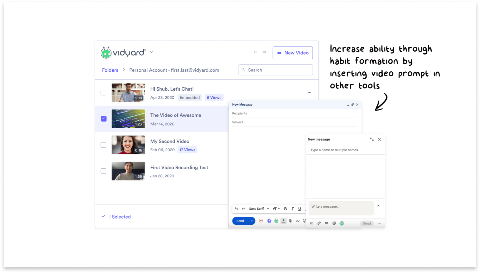Tactic: Increase ability through habit formation by implementing features that encourage regular interaction (e.g., prompts, notifications, etc. At Vidyard, we used our Chrome Extension to insert the Vidyard icon in common tools our customers used to help them build a habit of video creation.