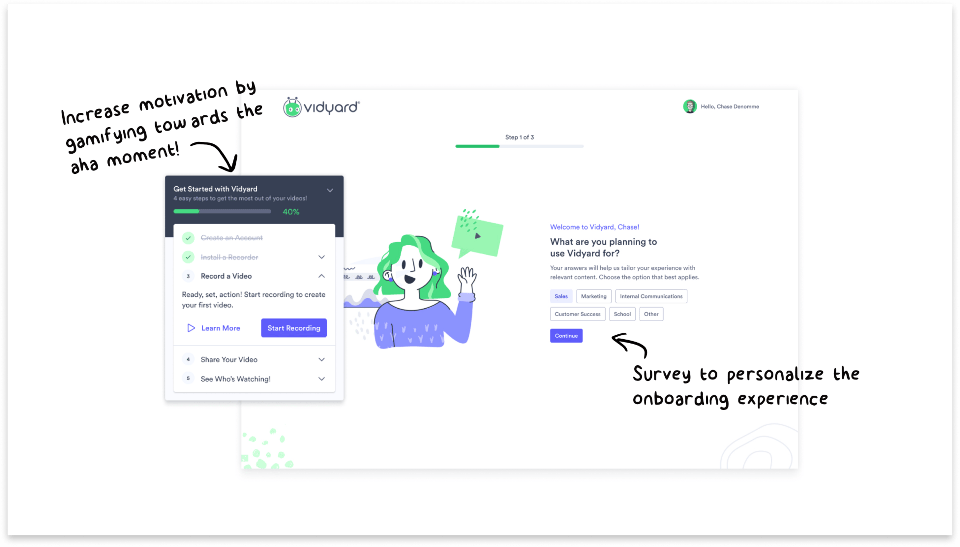Tactic: Personalize the onboarding experience based on the user's job-to-be-done identified in onboarding. This can make the 'aha' moment more relevant and impactful. It also helps decrease the time-to-value by removing workflows that are not relevant for them. Increase motivation by using gamification to lead straight to moments of value.