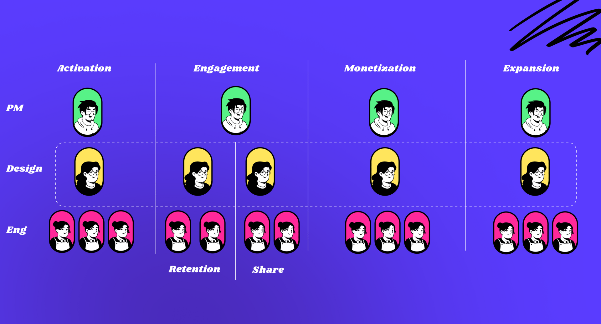 Centered around specific product surface areas or customer lifecyle stages, such as onboarding or checkout experiences, these teams focus on delivering impactful outcomes in targeted areas.