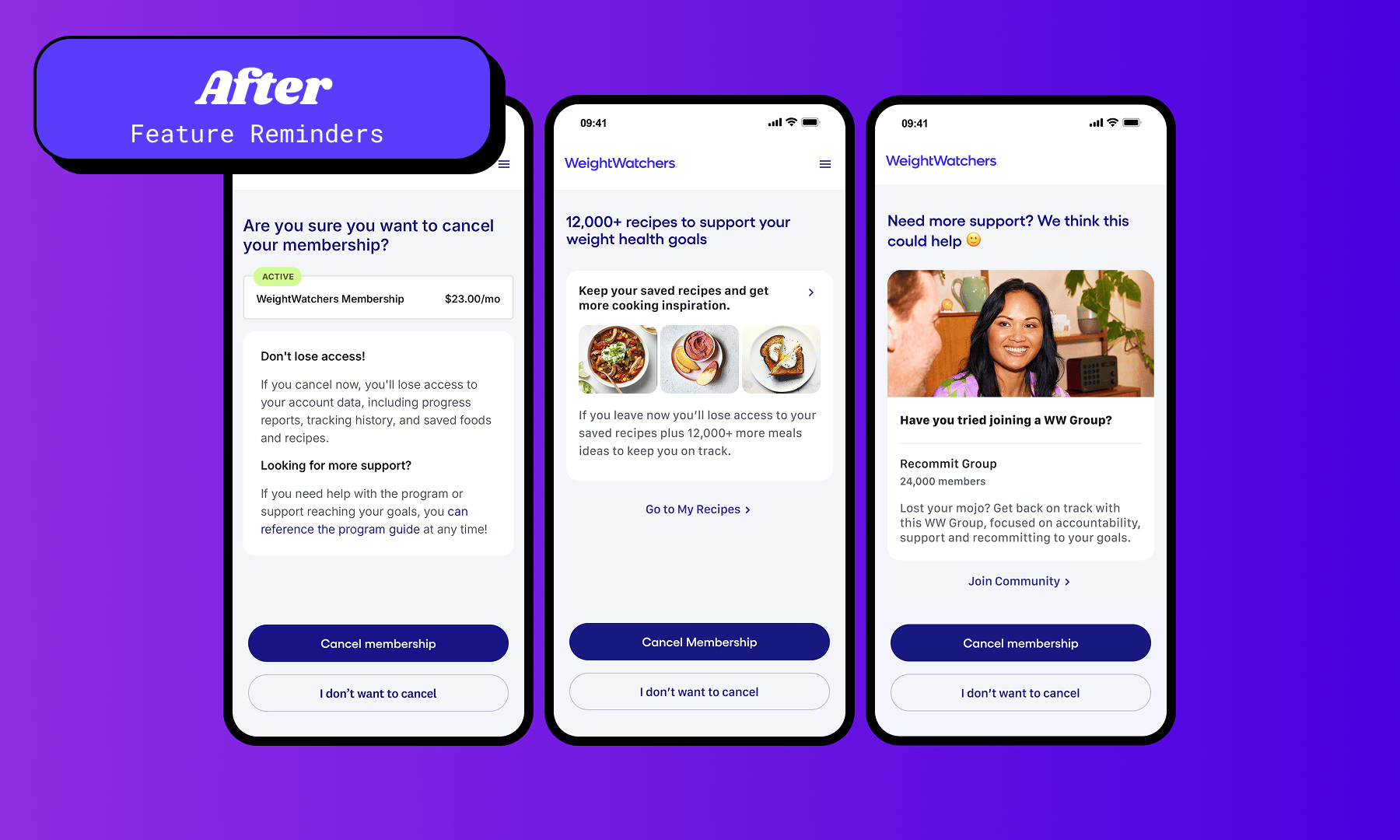 To highlight unused features we bet on several of the most popular features correlated with highly-engaged users (who retained longer), including saved recipes and WW Connect Groups.