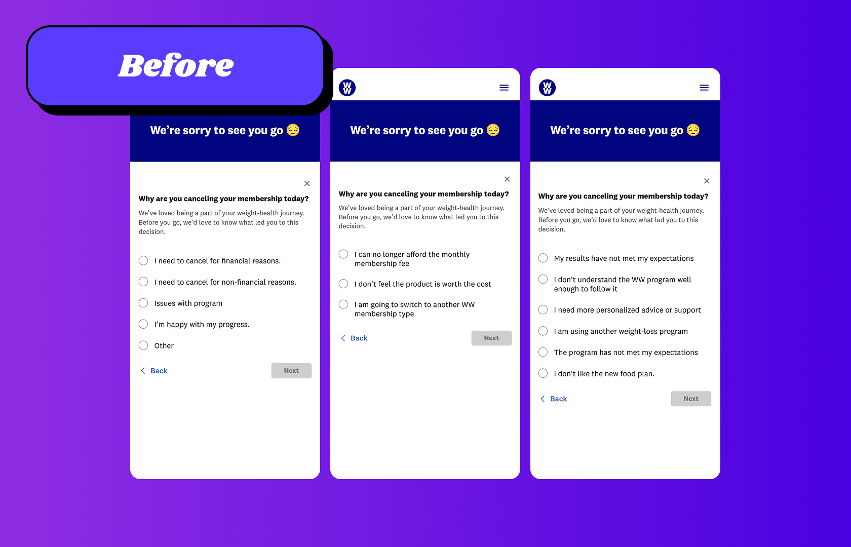 We also removed the survey questions and reduced the number of screens it took to reach a final save offer or exit, creating a calmer, more respectful experience.