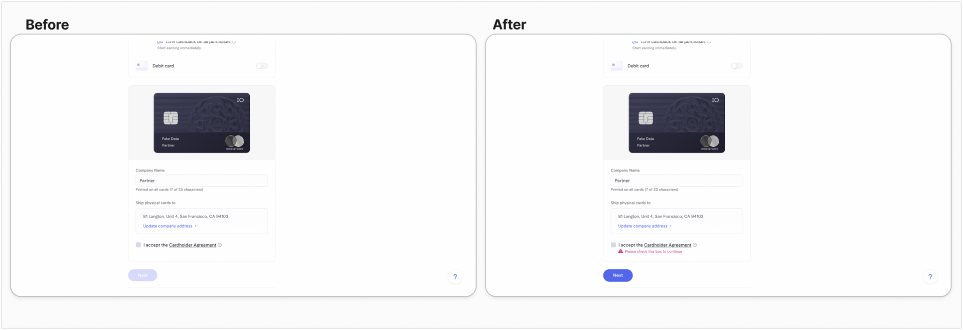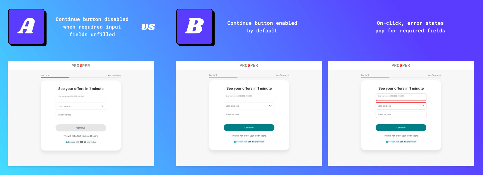 Prosper is a US-based personal finance company with loans and a credit card. I was so inspired by Andy’s Mercury test that I decided to try it as my first experiment as a new growth product manager at Prosper. I ran the experiment on the flagship personal loan application to improve page-over-page click-through rate. I made the button active by default like Mercury’s virtual card creation page. An error state would appear on click when required fields like email address were unfilled (instead of deactivated button until all required fields were filled.)