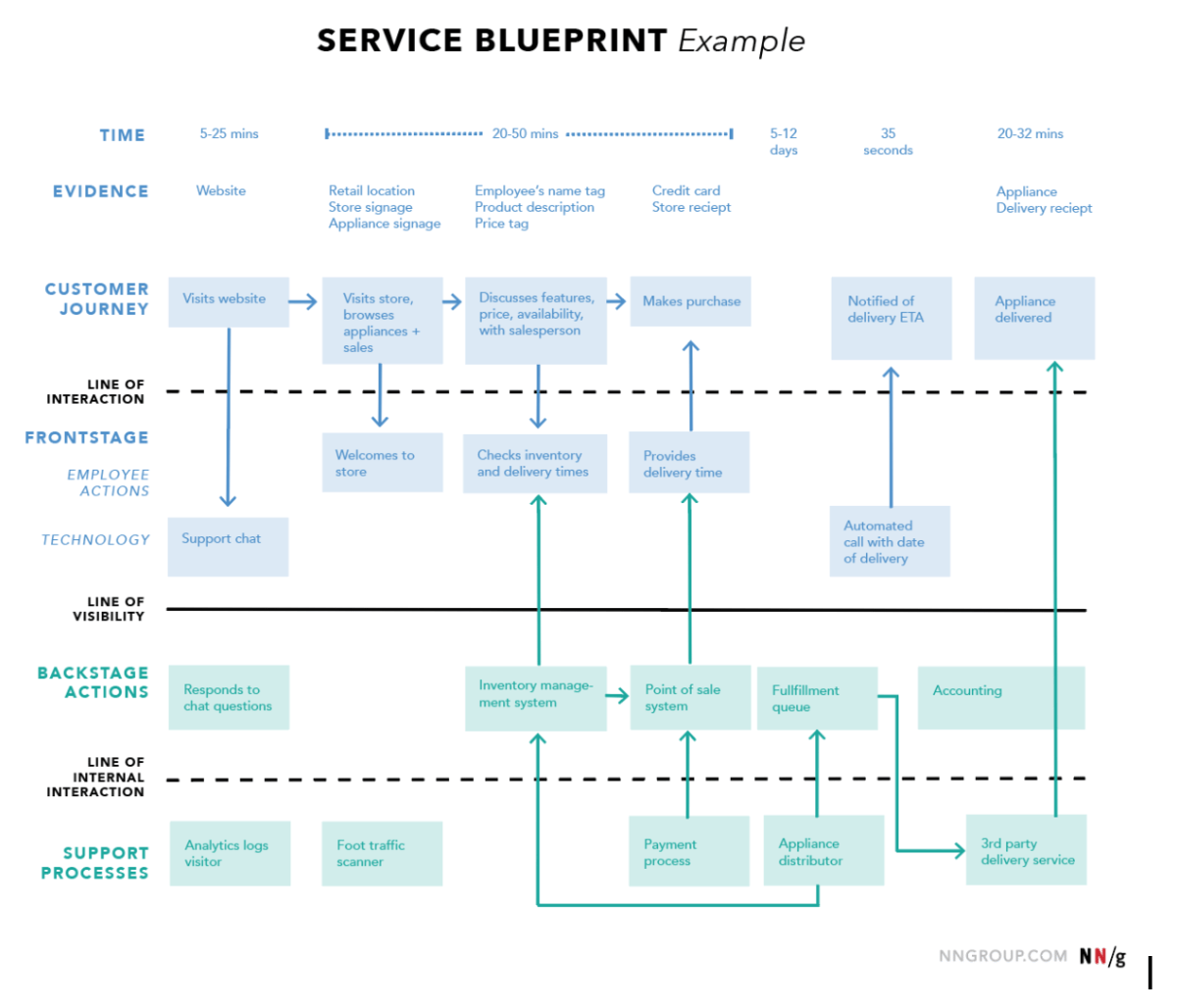 Start to map out the customer’s journey in a service blueprint similar to the one below. Each column represents a step in the customer journey, while each row represents a different aspect of the service’s operation. When the service blueprint is fully filled out, both the customer-facing touchpoints and all the service’s “backstage” elements should be present.There is much more info to share about service blueprinting than we have time for in this issue. You can visit Service Blueprinting - Nielsen Norman Group for a deeper dive.